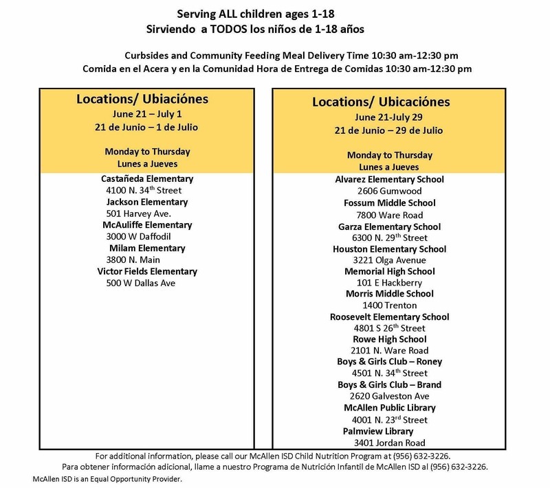 El Distrito Escolar Independiente de McAllen, en asociación con el Departamento de Agricultura De Texas, anuncia el patrocinio de comidas nutritivas gratuitas en los sitios de alimentación participantes. Los adultos pueden recoger las comidas para los niños con documentación de respaldo (número de identificación de la escuela o certificado de nacimiento). Paquetes de comida de viernes, sábado y domingo ofrecidos el jueves. Las comidas se proporcionarán en los siguientes sitios. Niños no es necesario ser estudiantes de McAllen ISD para participar.